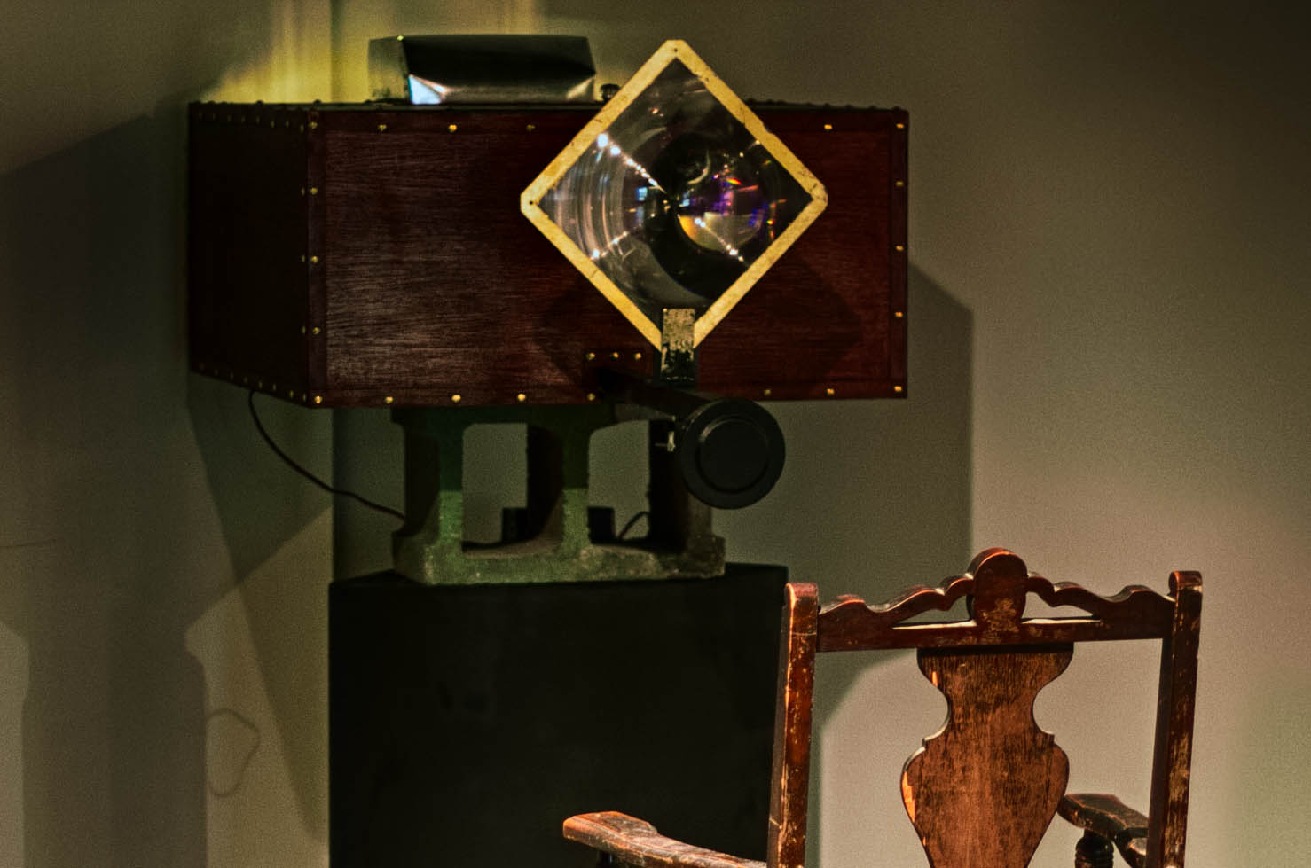 The interior mechanism is a Zoetrope, contructed from a re-purposed bicycle wheel, driven by a tiny electric motor. Each of the 17 interior cards holds a single digital frame of a hand drawn animation loop. The outer wooden laminate covers a fabrication created out of gaffers tape, foam core paperboard, aluminum scrap and spare parts from obsolete optical projection equipment.